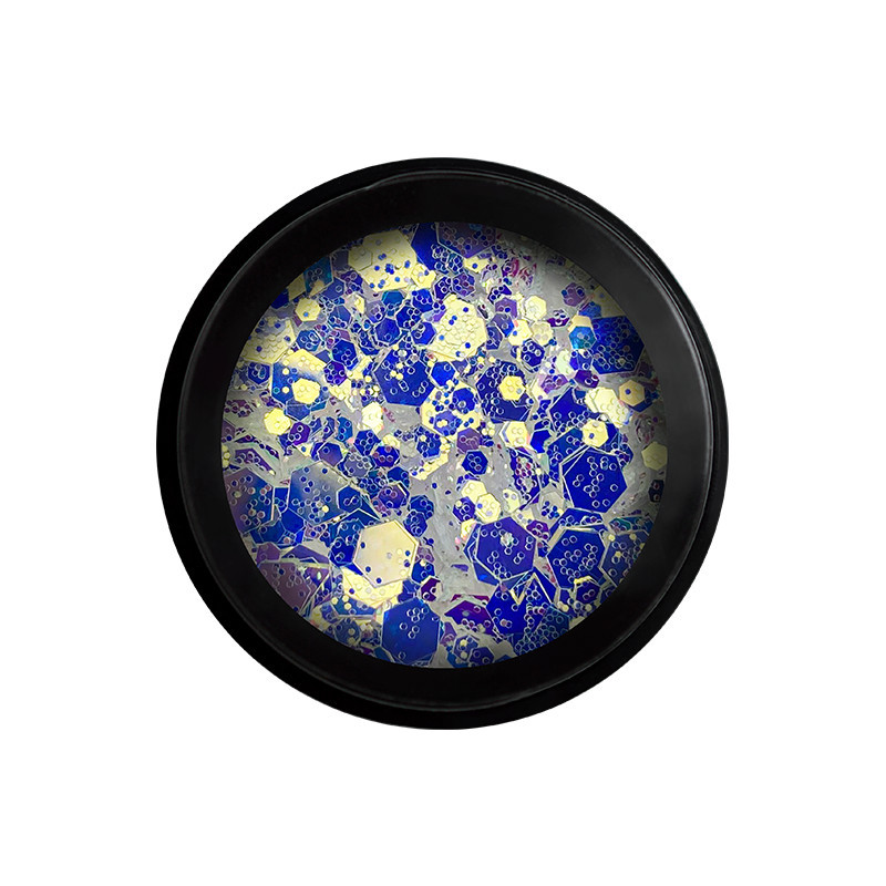 Kék és Arany színekben ragyogó, különböző méretű hexagonok és csillámok.