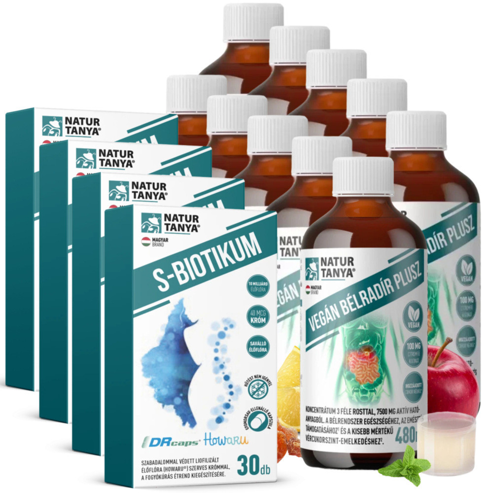 A csomag tartalma 4db Natur Tanya S-BIOTIKUM és 10db Natur Tanya VEGÁN Bélradír Plusz.