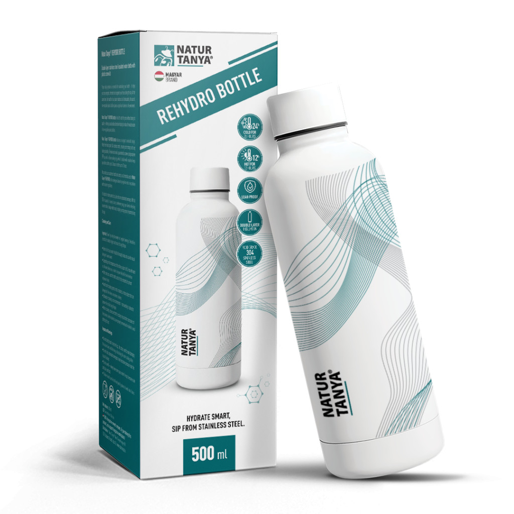 A Natur Tanya® REHYDRO palack, élelmiszerminőségű 304-es nemesacélból, kétrétegű, duplafalú hőszigeteléssel készült, elegáns és letisztult vizes palack, műanyag csavaros fedéllel. Akár 24 órán át hidegen, vagy 12 órán át melegen tartja az italokat. Cseppmentes, PP műanyag csavaros kupakkal és szilikon zárógyűrűvel záródik. Tartós, biztonságos és fenntartható alternatíva az egyszer használatos műanyag palackok helyett. 500 ml-es mérete ideális a mindennapokra.