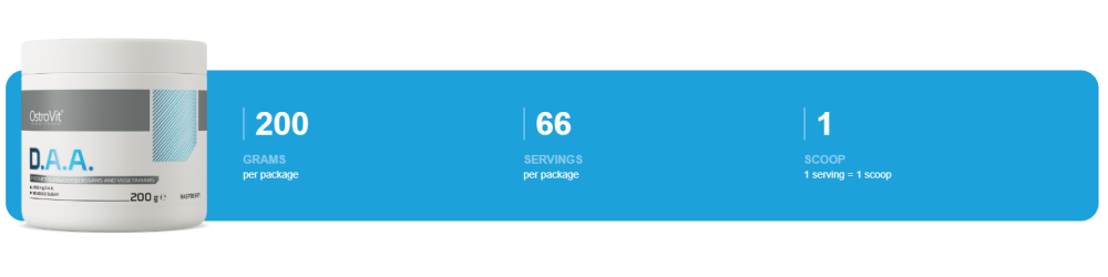 - D-aszparaginsav forrása – Egy adag étrend-kiegészítő 3 g D.A.A.-t biztosít a szervezetnek.