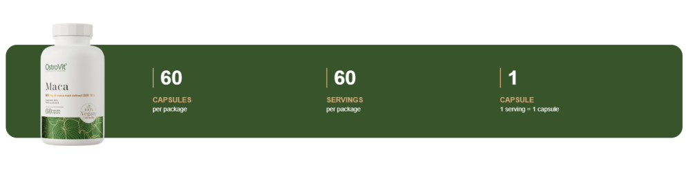 Az OstroVit Maca VEGE egy kiváló minőségű étrend-kiegészítő, amely maca gyökér kivonatot tartalmaz DER 10:1 arányban. Ez egy vegán készítmény, amely könnyen lenyelhető kapszulák formájában kapható. A termék aktív emberek és azok számára készült, akik értékes tápanyagokkal szeretnék kiegészíteni napi étrendjüket.