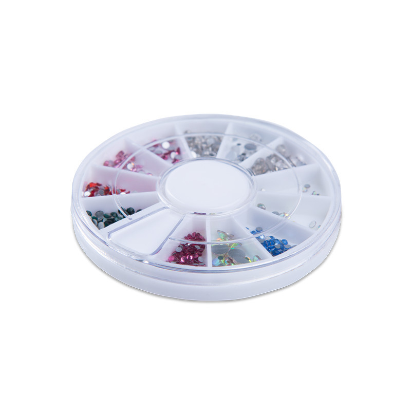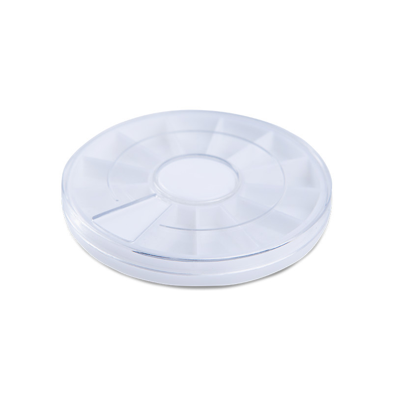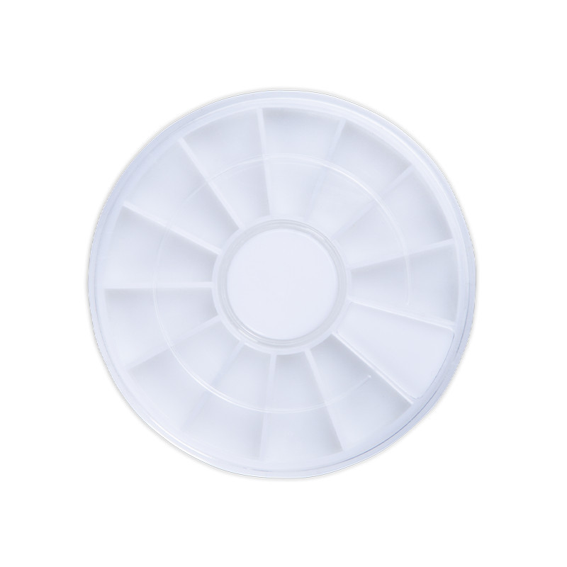 Műanyag, kerek strassztartó tálca, mely a legideálisabb megoldás körömdíszítő köveid, ékszereid tárolására. 12 rekeszében rendezetten tarthatod díszítőidet, könnyű belőle dolgozni és kényelmesen visszazárható. Kis helyen elfér, így praktikus megoldás szalonodban, a vendégeidnek pedig könnyebb választási legetőséget biztosít.