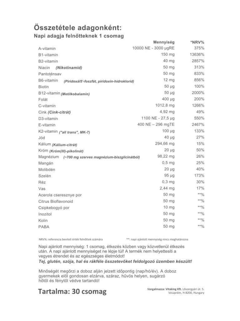 Minden doboz tartalmaz 30 kényelmesen hordozható csomagot, ami minden létfontosságú vitamint és ásványi anyagot tartalmaz a lehető legtermészetesebb formában. Minden napi multivitamin csomag tartalmazza az alábbi 5 készítményt: