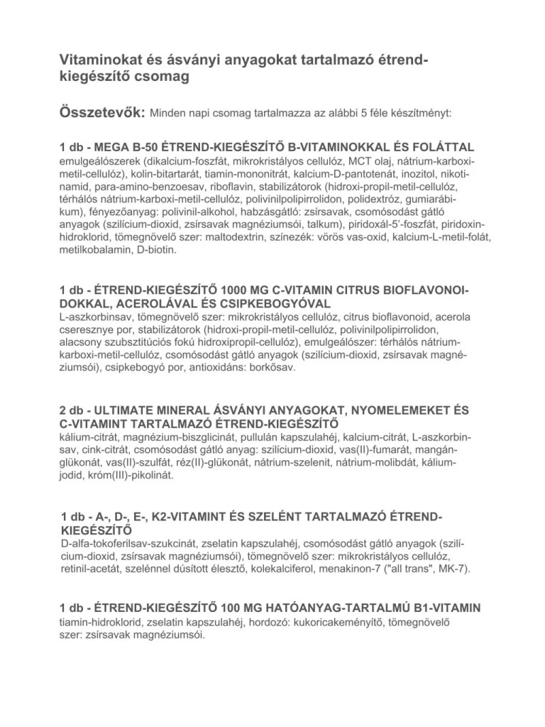 kálium-citrát, magnézium-biszglicinát, pullulán kapszulahéj, kalcium-citrát, L-aszkorbin- sav, cink-citrát, csomósodást gátló anyag: szilícium-dioxid, vas(II)-fumarát, mangán- glükonát, vas(II)-szulfát, réz(II)-glükonát, nátrium-szelenit, nátrium-molibdát, kálium- jodid, króm(III)-pikolinát.