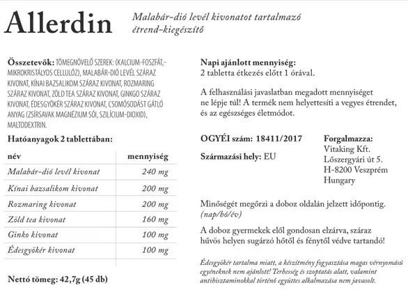 A malabár dió egy Ázsiában őshonos gyógynövény, melyet már régóta széles körben alkalmaznak a népi gyógyászatban. A levelei olyan növényi vegyületeket tartalmaznak, melyek erős élettani hatással rendelkeznek. A Vitaking Allerdin napi adagja 240 mg Malabár-dió levél kivonatot tartalmaz.