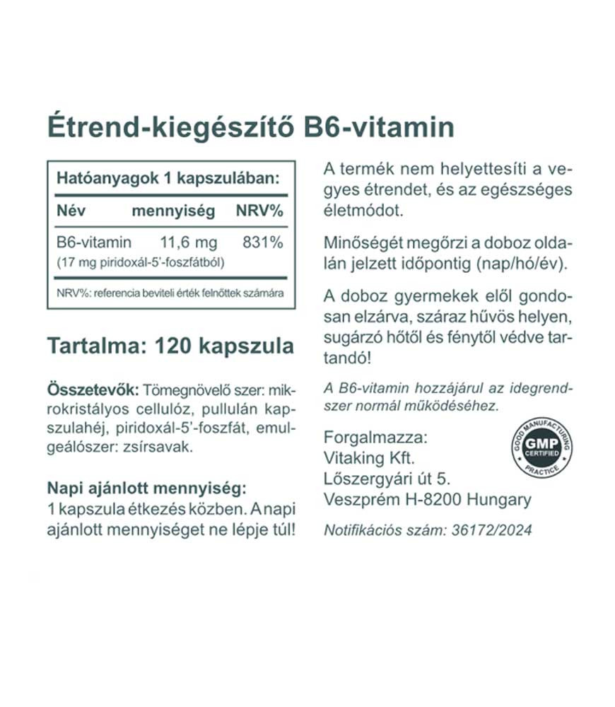 A készítmény kapszulánként 11,6 mg B6-vitamint tartalmaz (17 mg piridoxál-5’-foszfátból) így segíti a szervezet optimális támogatását a stresszes vagy megterhelő időszakokban.