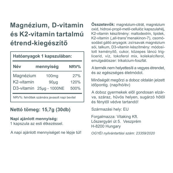 A Vitaking MagneTrio egyetlen kapszulában kiváló minőségben és nagy mennyiségben tartalmaz 3 fontos tápanyagot – magnézium citrátot, K2-vitamint és D3 vitamint!